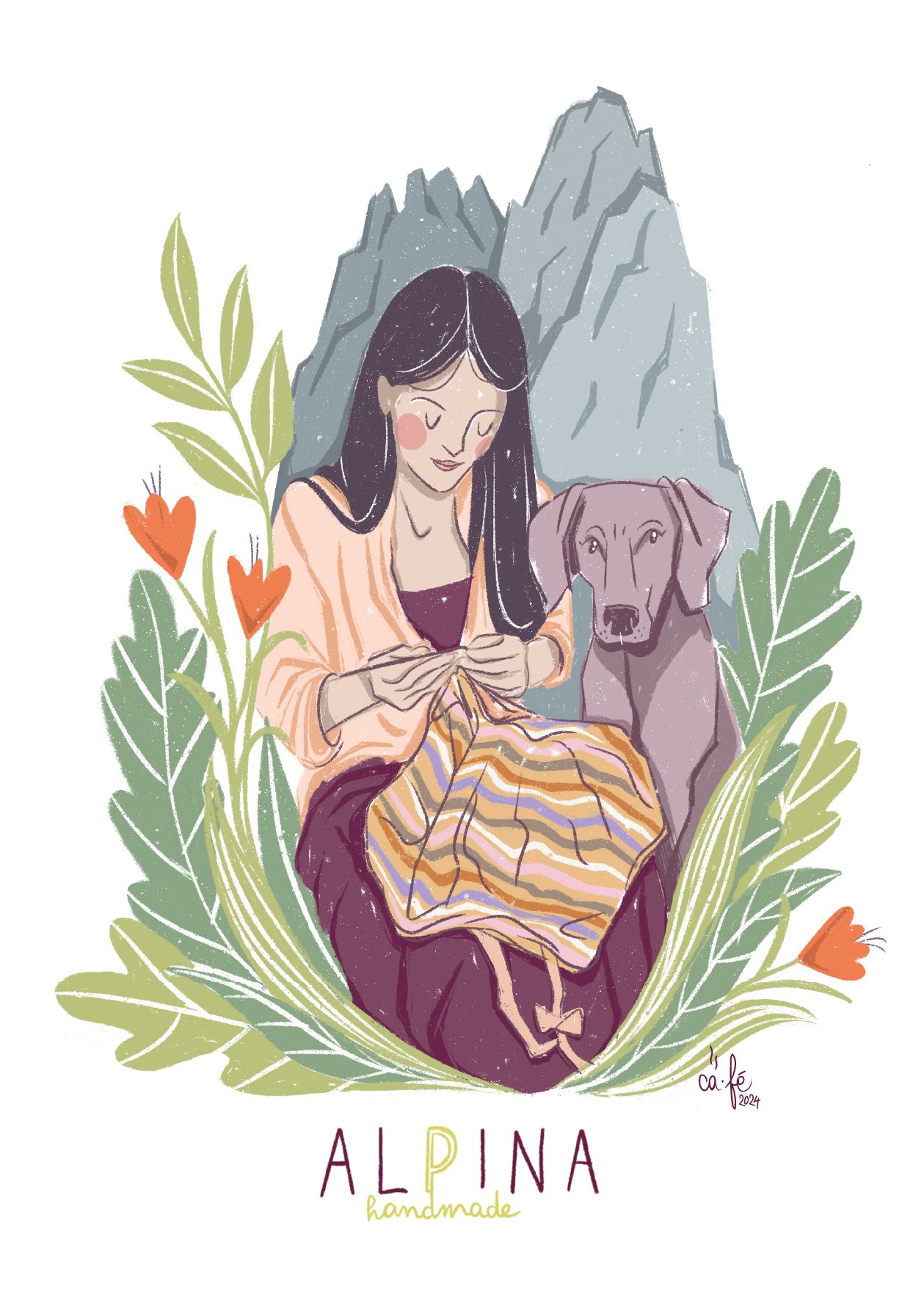 Ritratto illustrazione per Alpina handmade, brand di artigianato che crea lavori fatti a maglia e all’uncinetto. Una volta creato il ritratto ho progettato la cartolina e gli stickers che Alpina mette in ogni suo ordine!